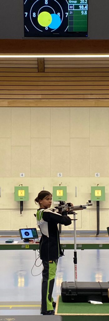 Mittlerweile sehr routiniert spulte Magdalena Sebele (Eglharting/Glonn) ihre 40 Wertungsschuss ab. Mit sehr guten 402,4 (99,8/100,5/100,6/101,5) Ringen belegte sie in einer sehr starken Konkurrenz den guten 24. Platz. Sie hat damit das Ticket für die Deutsche Meisterschaft genauso in der Tasche wie Ottersbergs Franziska Strasser. Sie war zeitgleich in Pilsen (Tschechien) im Einsatz, so dass sie mit ihrem Qualifikationsergebnis von hervorragenden 415,2 Ringen in der Ergebnisliste außer Konkurrenz lief. Auf dem 60. Platz mit 395,4 Ringen von 139 Teilnehmerinnen landete Maria Glaser (Ingelsberg). Nur knapp dahinter auf dem 65. Platz reihte sich Kira Förster (Markt Schwaben) mit 394,8 Ringen ein. Sehr zur Freude der Trainer steigerte Glonns Sofie Huber wie bei der Oberbayerischen Meisterschaft wieder ihre persönliche Bestleistung. Mit 387,9 Ringen lag sie auf dem 104. Platz. Anscheinend braucht sie großes Publikum, um dann nervenstark, zur Topform aufzulaufen. Allerdings ist für sie die Bayerische Endstation. Wer weiß was sie sonst bei der Deutschen abgeliefert hätte -😊