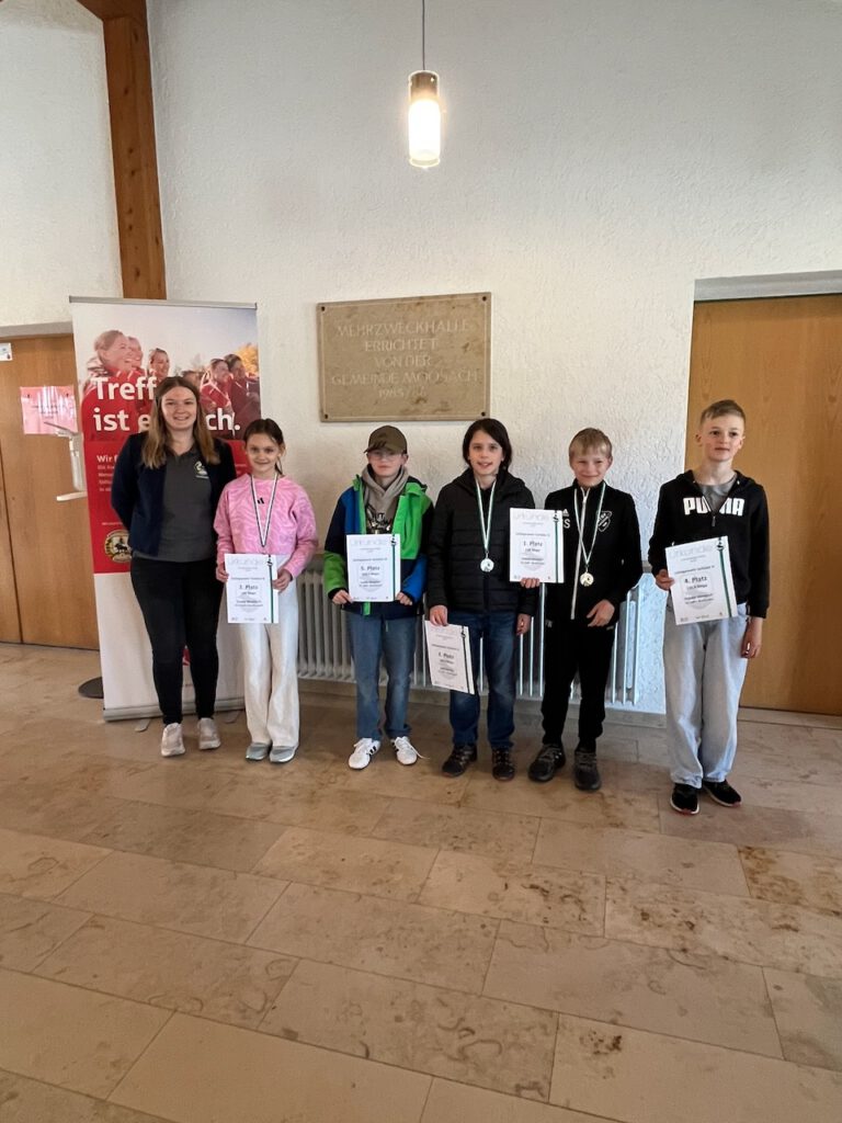 Bei den jüngsten Pistolenschützen setzte sich Johannes von Schierstädt (SG Berganger-Rohrsdorf) mit Vorkampf 150 Ringen und Gesamt nach dem Finale mit 241 Ringen durch. Besonders spannend war der Kampf um Platz zwei, bei dem Simon Maier (Vorkampf 147 Ringe) und Benedikt Schmid (Vorkampf 138 Ringe) dann ringgleich bei 216 Ringen waren – hier entschied ein Stechen zugunsten von Simon Maier mit 10 zu 9. Als einzige Starterin konnte sich Katharina Reischenbeck bei ihrem ersten Wettkampf über Rang vier mit 127 Ringen im Vorkampf und einem Finale mit 67 Ringen freuen. Auch die Mannschaftswertung ging geschlossen an die 3 Jungs aus Berganger-Rohrsdorf.