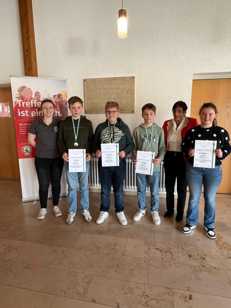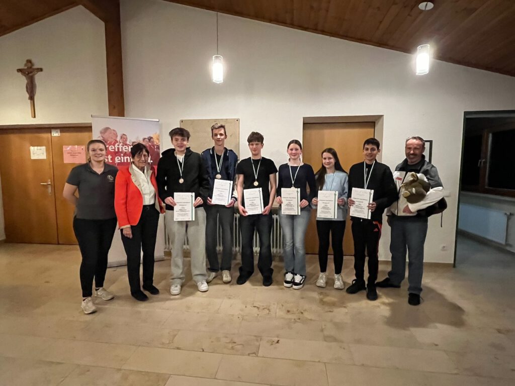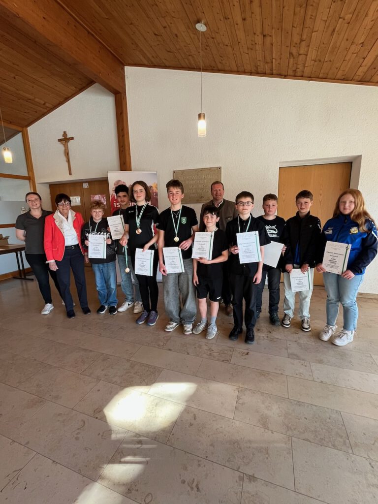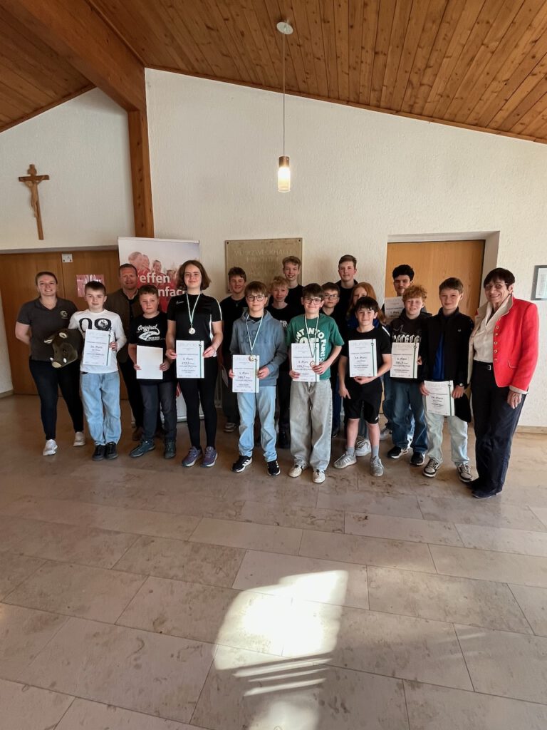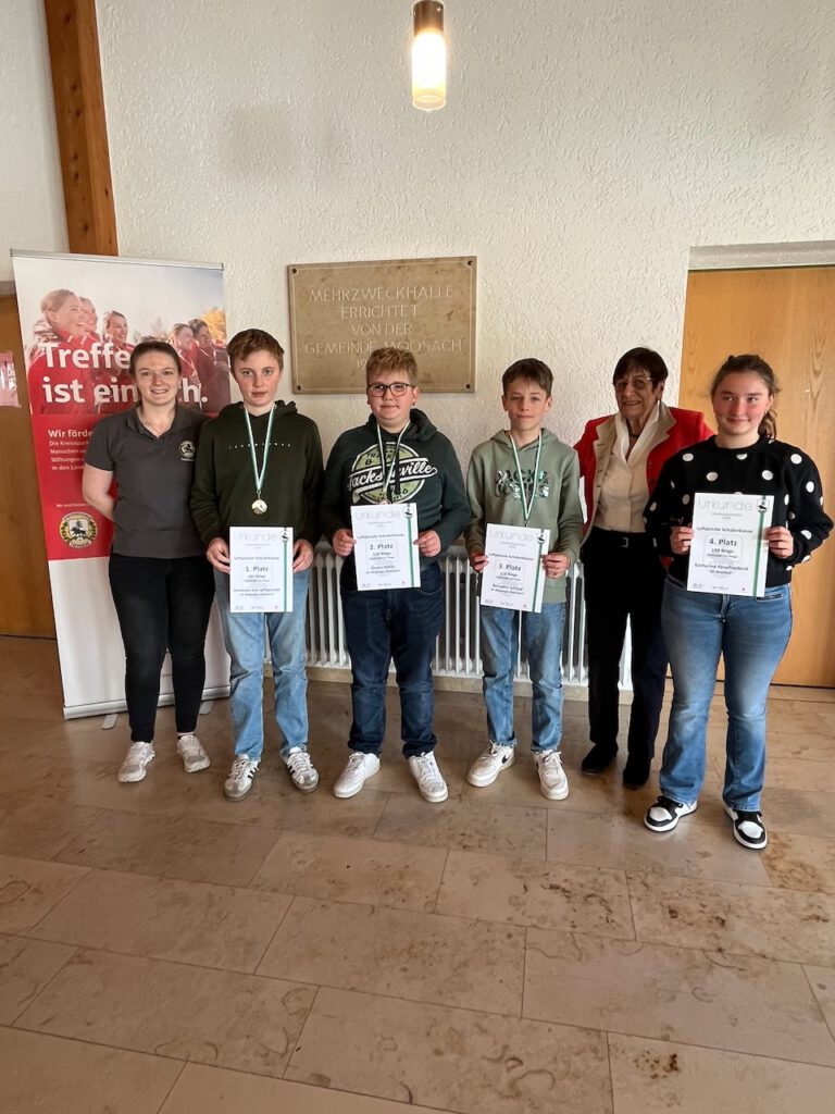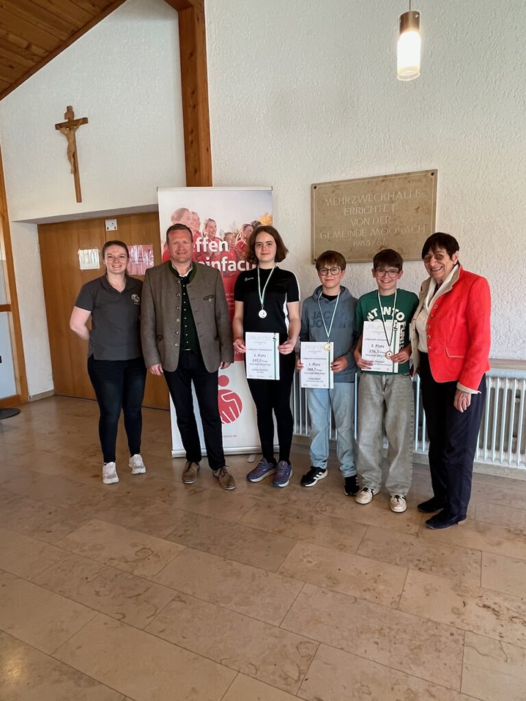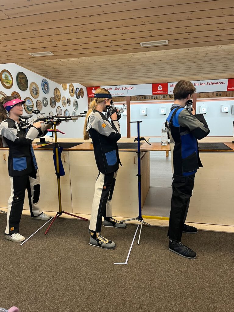 Die Mannschaftswertung ging an den SV Frohsinn Egmating 472,5 Ringe in der Besetzung Sebastian Egerland, Matthias Egerland und Janne Lanzafame vor der SG Adler Kirchseeon 468,1 Ringe mit Sebastian Schnabel, Luis Moritz, Johannes Haring und der SG Tulling 434 Ringe mit den Schützen Sophie Feraschin, Felix Pelzer, Johanna Daberger.