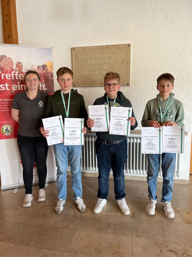 In der Luftgewehr-Schülerklasse entwickelte sich ein spannendes Finale. Als Vorkampfsiegerin zog Sophie Feraschin (SG Tulling) mit einem Vorsprung von 2,1 Ringen ins Finale ein. Jakob Sebele (SG Hubertus Eglharting) konnte diesen Rückstand jedoch aufholen und sich am Ende mit einer starken Finalleistung den Sieg sichern.