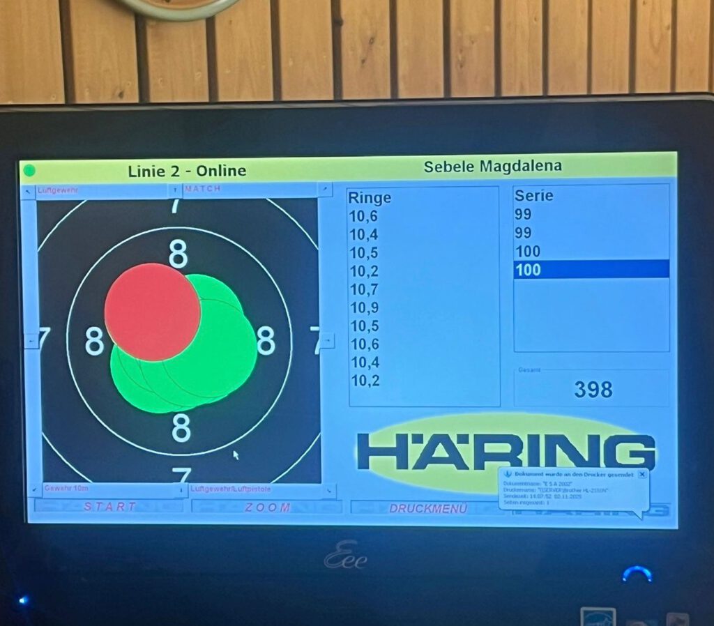 In der zeiten Begegnung stand mit dem ungeschlagenen St. Wolfgang ein noch dickerer Brocken auf dem Programm. Auf der Eins kam es zum Top Duell. Magdalena Sebele gegen die zweitbeste Schützin Regina Müller am ersten Wochenende. Während Regina ihren Wettkampf mit sehr guten 393 Ringen beendete, hatte Magdalena noch 16 Schuss zu absolvieren. Nach Serien von 99,99 zeigte sie trotz der hohen Vorgabe keine Nerven und legte zwei lupenreine 100èr Serien nach und schoss mit herausragenden 398 Ringen ihr RWK-Bestergebnis. Viktoria Amstadt musste ebenfalls „nachschießen“ Auch sie hatte ihre Nerven wie Drahtseile und übertrumpfte ihren Gegner mit 390 zu 389 Ringen. Punkt zwei für Glonn. Alexandra Huber verlor hauchdünn mit guten 385 zu 386 Ringen. Somit nur noch 2-1 für Glonn. Auf der vier packte St. Wolfgangs Julia Schönhuber starke 391 Ringe aus und lies Tobias Hartl (378) keine Chance. 2-2 nach Einzelpunkten. Nun lag es an Lena Schneider, die ebenfalls einen langsameren Rhythmus als ihr Gegner hatte. Während Christian Schmidhuber den Wettkampf mit 381 Ringen beendete, musste Lena noch fünfmal anlegen. Die Hochrechnung praktisch über den gesamten Wettkampf stand im direkten Vergleich auf Rot. Das bedeutete einen Gleichstand. Aber Lena ließ sich auch davon nicht beeindrucken und schoss einfach mit Zehnern aus., so dass sie am Ende sogar mit zwei Ringen (383 Ringe) ihre Partie gewann. Am Ende war der Jubel groß. Mit einem 3-2 gegen den großen Favoriten hätte niemand gerechnet.