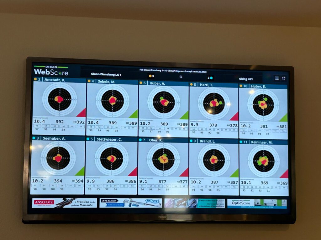 Diesmal setzte Glonn, das sowieso mit Abstand das jüngste Team der Liga stellt, auf die erst 15-jährige Lisa Huber als Ersatz. Lisa zeigte eine beeindruckende Leistung auf Position fünf. Obwohl ihr erster Wertungsschuss eine Sieben, nicht ihren Wünschen entsprach, ließ sie sich nicht aus der Konzentration bringen und hatte am Ende sehr gute 381 Ringe und gewann deutlich gegen Michale Reininger (369). Auf der vier musste Tobias Hartl mit 377 Ringen seinen Punkt gegen Leonhard Brandl (387) abgeben. Alexandra Huber fieselte ihren Gegner Robert Ober mit starken 389 – 377 Ringen ab. Um Sieg oder Niederlage ging es somit in den Paarungen Eins und Zwei. Paarung Eins war zuerst fertig. Hervorragende 392 Ringe reichten für Viktoria Amstadt leider nicht. Alexander Seehuber gewann mit 394 Ringen. Nun hing es an Magdalena Sebele. Ihr Gegner Christoph Stettwieser beendete seinen Wettkampf mit 386 Ringen. Magdalena musste sieben Schuss „nachschießen“ und war auch als letzte am Stand. Alle Augen waren somit auf sie gerichtet. Nervenstark trotz hohem Puls schoss sie eine Zehn nach der anderen und holte den Sieg mit 389 Ringen „nach Hause“